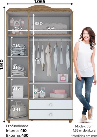 Apesar de ser um roupeiro para bebê, o móvel consegue ser bem amplo com 1,875 mm de altura, 1,065 mm de largura e 430 de profundidade. Dessa forma, mesmo com o crescimento do bebê não será necessário comprar um guarda-roupa novo em pouco tempo. O roupeiro Ciranda da conta do recado.