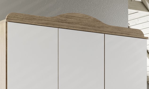 Ele também conta com um chapéu ao estilo provençal. Para aqueles que não sabem, o chapéu é aquela parte de madeira que vem em algumas peças e que ajuda a esconder itens que colocamos em cima do roupeiro como caixas.