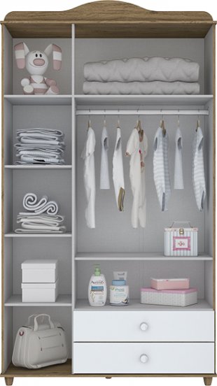 Não adianta se o roupeiro é grande se não tem boas divisórias. Quanto mais divisórias, mais organizado ficará o roupeiro, facilitando a vida dos pais na hora de encontrar o que precisam. O roupeiro Ciranda conta com duas gavetas perfeitas para guardar diversas roupas como bodies, calças, meias e peças menores, um cabideiro para pendurar as roupinhas maiores e outras peças que não podem amassar.